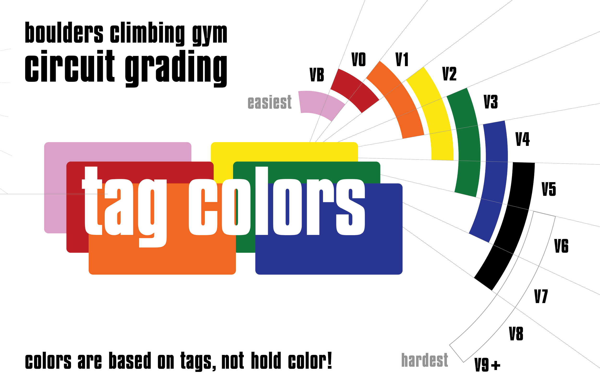 Climbs generally get harder as the rainbow progresses, with pink being the easiest (a great starting point for beginners) and white being the hardest, although it is subjective and there is some overlap.